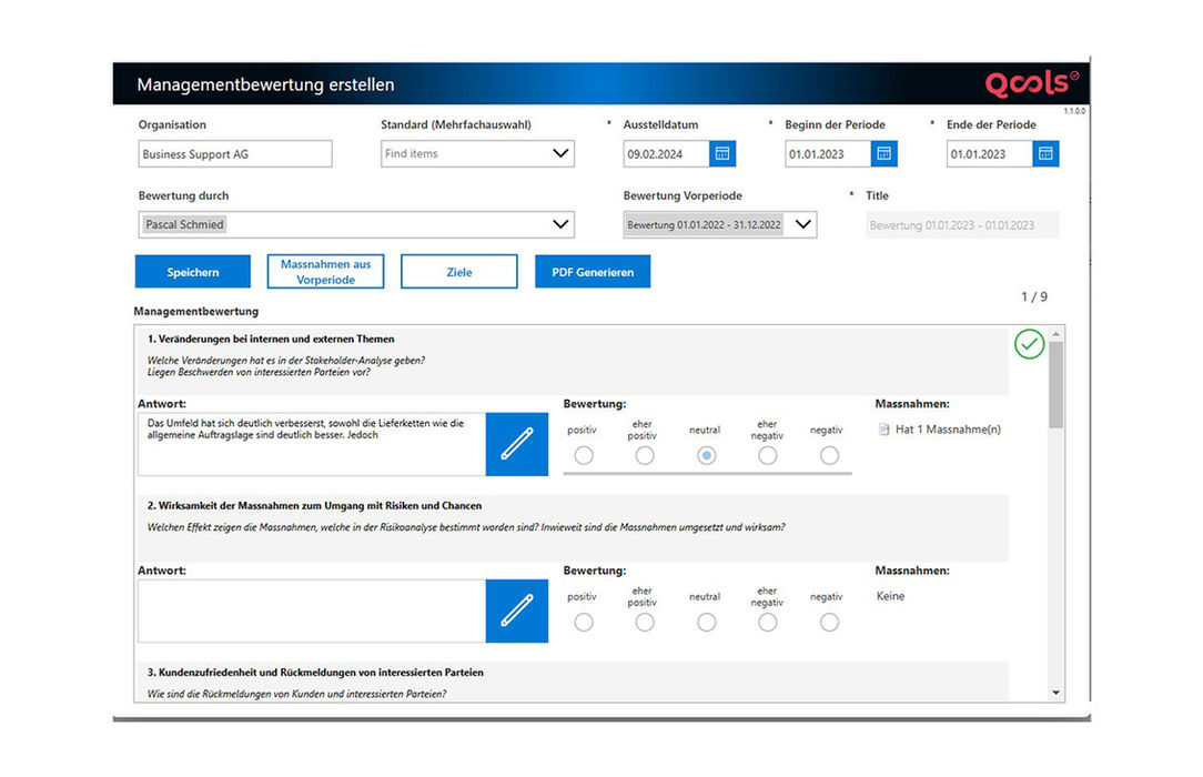 Mit der Q-Review App wird die Durchführung von Managementbewertungen einfacher als je zuvor. Die App bietet Ihnen ein benutzerfreundliches Tool, das speziell zur Unterstützung von normkonformen Managementbewertungen gemäss ISO 9001, ISO 14001 und ISO 45001 Abschnitt 9.3 und weiteren ISO Normen entwickelt wurde. Dank eines normenkonformen und anpassbaren Fragekatalogs behalten Sie alle relevanten Inhalte im Blick und erfüllen die Anforderungen mühelos.